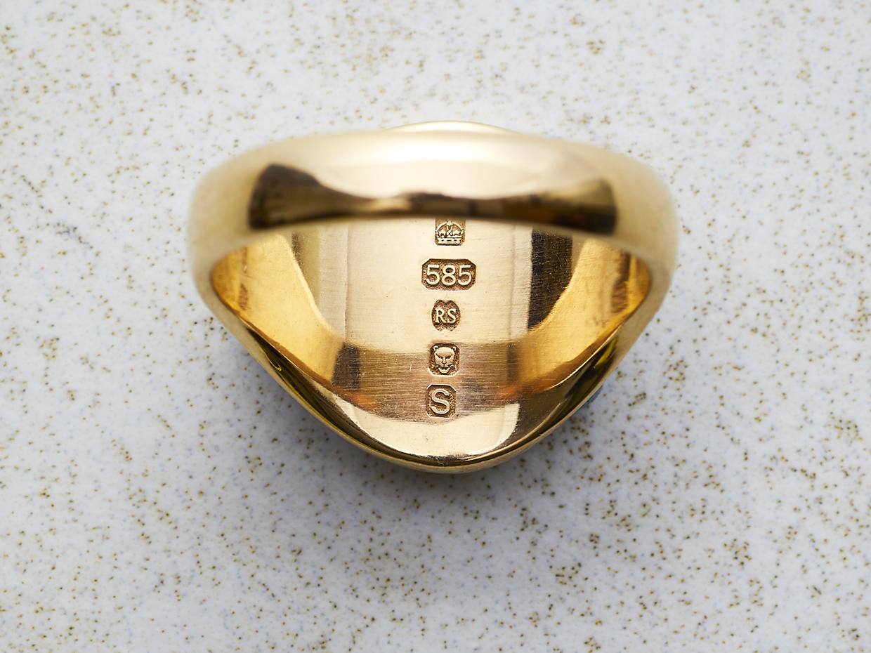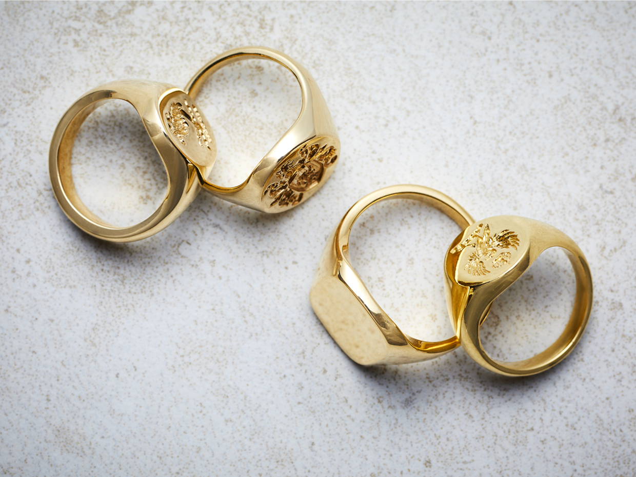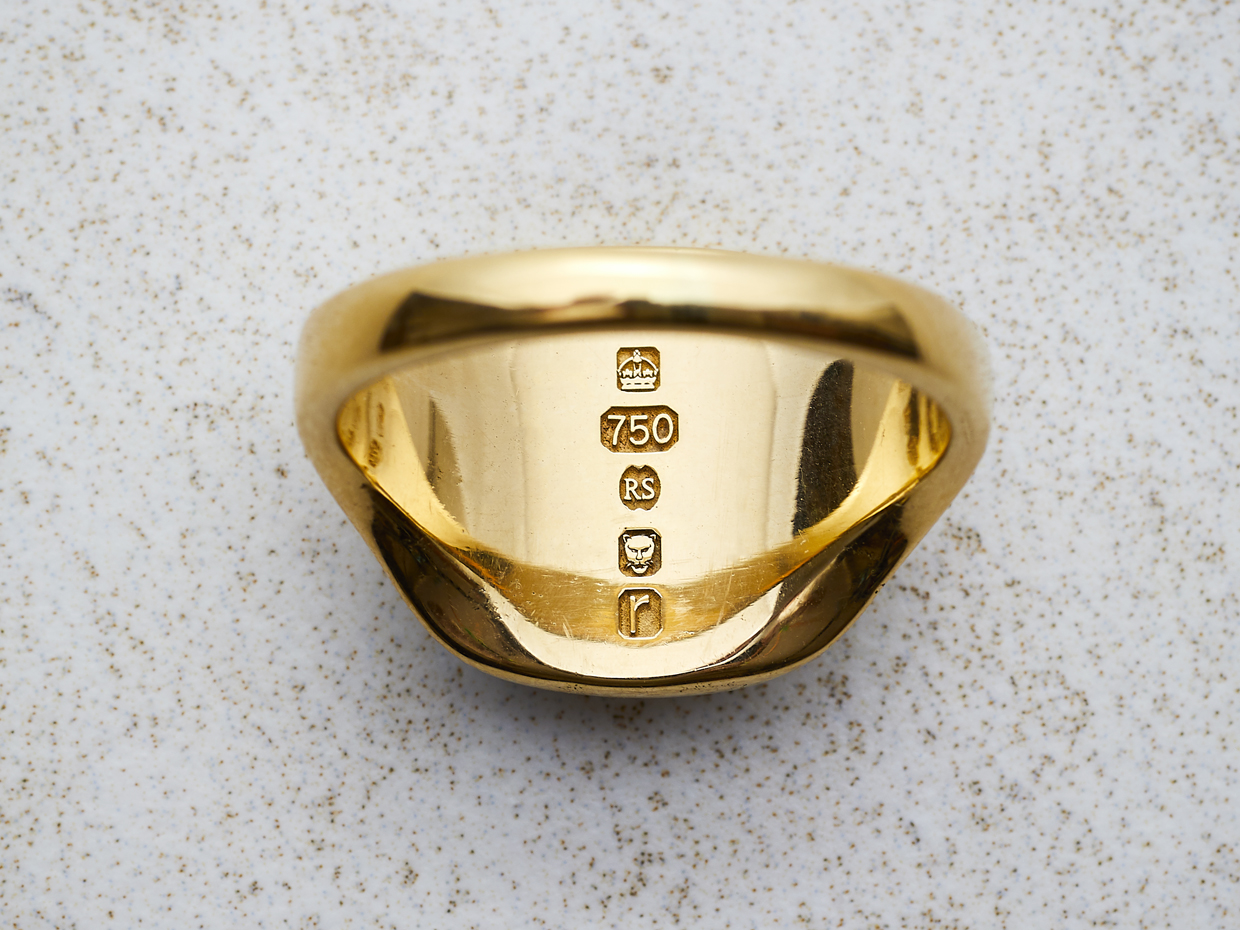 Containing 585 parts of pure gold per thousand, 14ct gold is a popular and well-balanced choice for a signet ring. It strikes the ideal balance between richness and strength — over half pure gold, yet resilient enough to withstand the demands of everyday wear. The heavy-weight Rebus gold signet rings, available in 9ct, 14ct, and 18ct gold, are hand forged and engraved to order. In both colour and durability, 14ct gold sits beautifully between the two, making it an ideal middle ground for those seeking elegance and longevity.