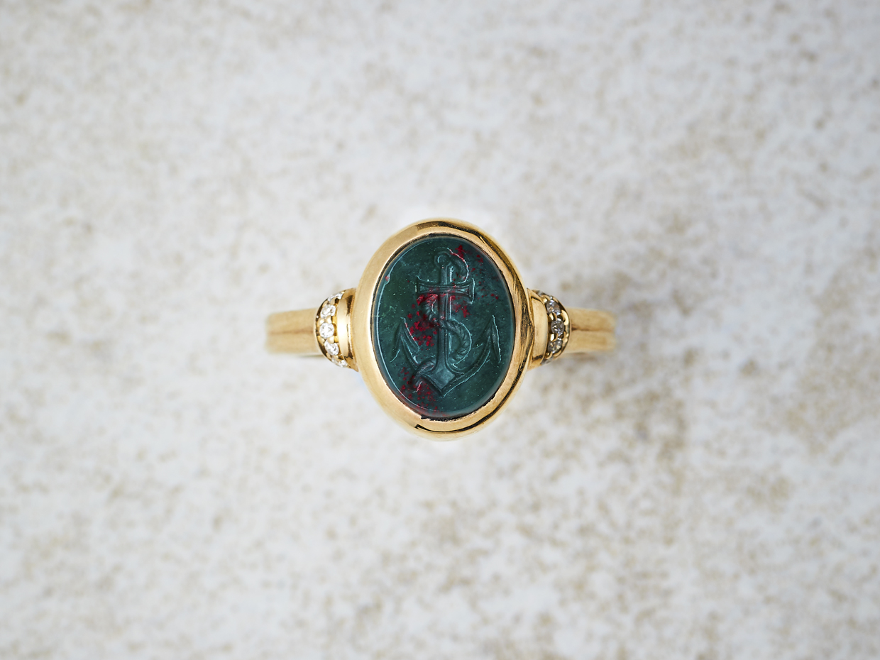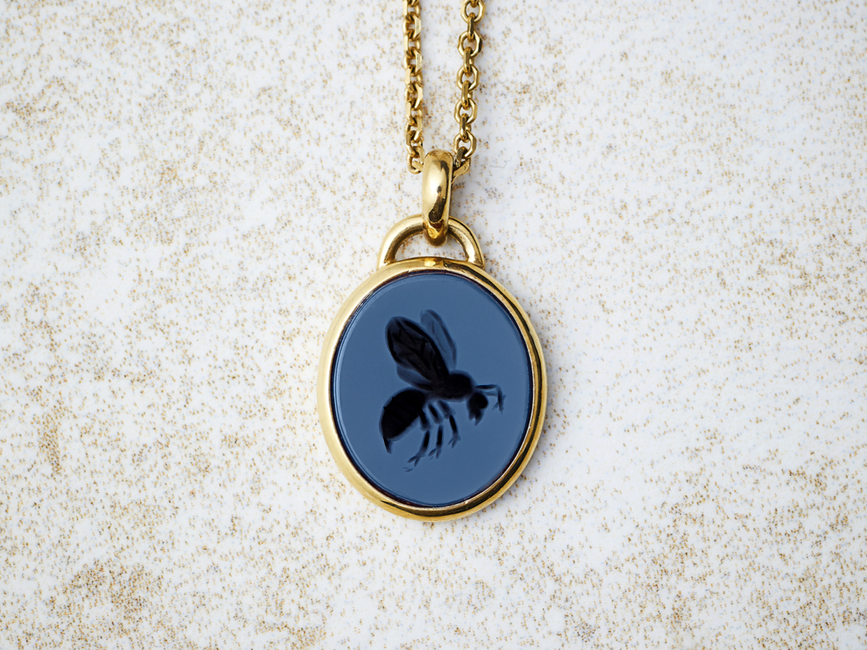Use of Sardonyx appears in the art of Minoan Crete, notably from the archaeological recoveries at Knossos. Sardonyx comes in a wide range of natural colours and shades. The Sardonyx coloured bands are Sard (top layer), meaning colours other than the onyx (bottom layer), the combination of the two elements giving rise to its name. The colours we can offer in signet rings are petrol blue cutting through to black and creamy white cutting through to amber. The contrast between the stone layers once engraved makes for a striking seal engraving. These qualities made it a favourite with the ancient Romans, who believed that the virtue of stones could be increased if suitably engraved.
